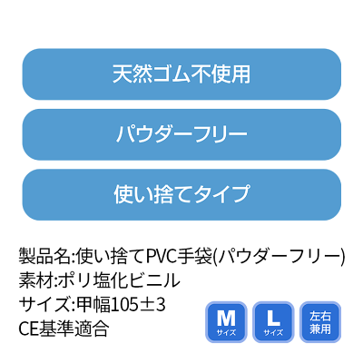 【製品について】 ●製品名:使い捨てPVC手袋(パウダーフリー) ●素材:ポリ塩化ビニル ●サイズ:甲幅105±3 Mサイズ Lサイズ ●原産国:中国 MADE IN CHINA ●CE基準適合 ●天然ゴム不使用 ●パウダーフリー ●使い捨てタイプ 用途多彩なPVC製グローブ。