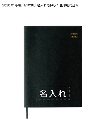 名入れ範囲:120×50mm以内(端から10mmは不可) 名入れ色:金・銀・白・黒・赤・青・緑(メタリック) 納期:校了後、約2週間 ■ご注文の流れ ■本体仕様 本体定価:1980円 ページ数:208ページ サイズ:210×148mm(中身) 内容:カレンダー・年間スケジュール・月間予定表・週間予定表・ 次年度年間スケジュール・横罫・パーソナルノート 表紙:PVC 製本:糸かがり製本 期間 月間:2019年11月〜2020年12月 週間:2019年12月〜2020年12月